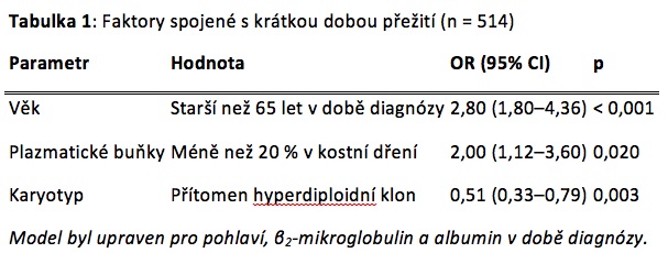 Cílem studie byla identifikace demografických, klinických a cytogenetických vlastností spojených s velmi krátkou, tříletou dobu přežití pacientů s mnohočetným myelomem (MM) se standardně rizikovou cytogenetikou.